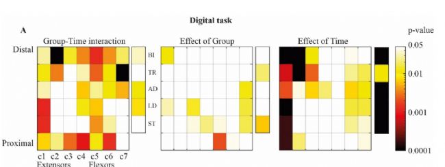 圖3 (A)數(shù)字任務(wù)中EMG變異性變化。 使用顏色映射表示ANOVA結(jié)果的p值,包括組與時(shí)間的交互作用(左側(cè))、組的主效應(yīng)(中間)和時(shí)間的主效應(yīng)(右側(cè))。BI為肱二頭;TR為肱三頭;AD為前三角;LD為外側(cè)三角。籗T為上斜方肌。