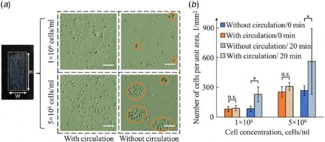 應(yīng)用生物墨水循環(huán)能提高生物打印片材內(nèi)細(xì)胞空間分布的均勻性,圖5(a)為生物打印片狀結(jié)構(gòu)中細(xì)胞分布的影響(隨機(jī)選擇面積為0.5×0.5mm的10個(gè)樣本)。圖 5(b)顯示了不同細(xì)胞濃度下生物打印片材的相應(yīng)細(xì)胞分布結(jié)果,當(dāng)無墨水循環(huán)時(shí),低細(xì)胞濃度和高細(xì)胞濃度的高標(biāo)準(zhǔn)差反映了細(xì)胞聚集程度高、細(xì)胞分布不均勻,突出了解決細(xì)胞沉積和聚集問題的必要性。