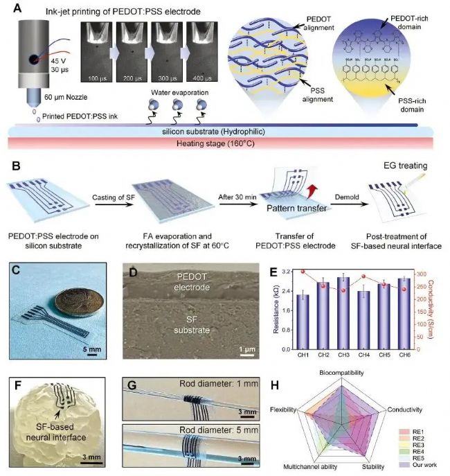 基于熱溫輔助圖案轉(zhuǎn)移技術(shù),研究人員成功將噴墨打印的PEDOT電極轉(zhuǎn)移至SF柔性襯底,制備了具有6通道電極的非瞬態(tài)SF柔性神經(jīng)接口(圖3)。神經(jīng)接口器件前端采集點尺寸越小,所采得腦電信號越精確。此外,更小的器件尺寸也利于縮小植入創(chuàng)面。與現(xiàn)有SF基神經(jīng)電極/接口材料相比,本研究制備的SF柔性神經(jīng)接口在共形性、水穩(wěn)定性和更小電極尺寸方面具有明顯的優(yōu)勢。