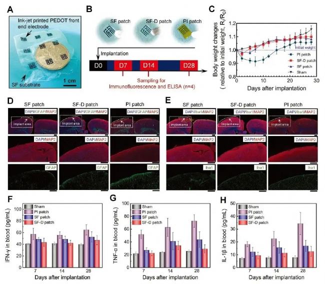 針對非瞬態(tài)SF柔性神經(jīng)接口的生物相容性這一關(guān)鍵問題,研究團隊圍繞術(shù)后動物生存狀況、免疫反應(yīng)和血液中炎癥因子含量進行了重點考察評估,如圖5所示,以PI貼片(PI膜用作基材,PEDOT:PSS噴墨打印電極)為對照組,相關(guān)結(jié)果表明,SF神經(jīng)接口具有良好的柔性、共形性和低免疫原性,術(shù)后大鼠短期內(nèi)可恢復(fù)正常生理功能、皮質(zhì)表層未見明顯擦傷,且血液中炎癥因子表達處于較低水平,這將有利于后期臨床應(yīng)用研究。因此,這些長期生物相容性和非瞬時SF潛在功能化的增強有望開發(fā)出一種高效和安全的“一體化”神經(jīng)接口。