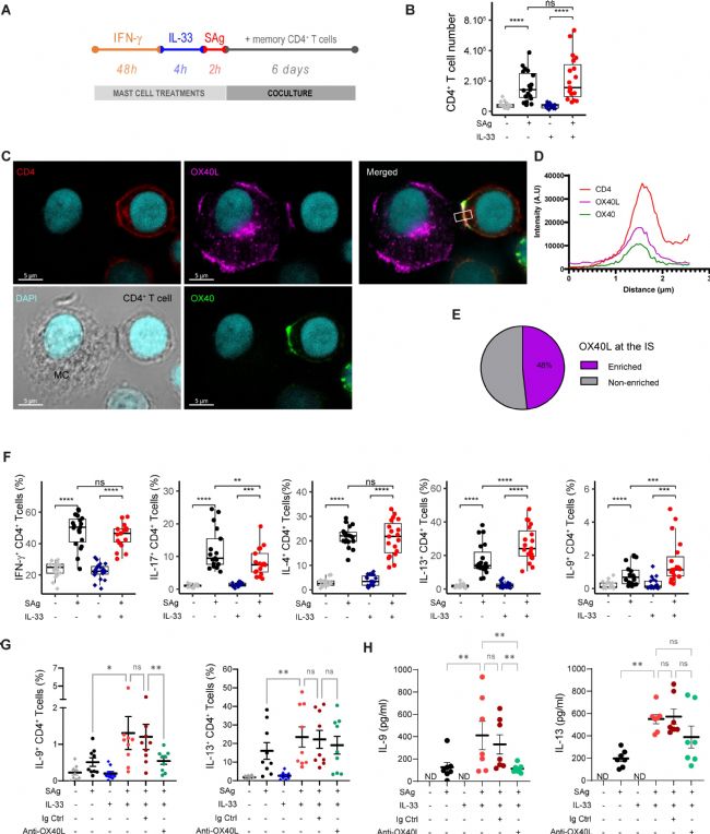 基于此,法國(guó)圖盧茲的癌癥治療中心及圖盧茲第三大學(xué)的研究人員在一項(xiàng)研究中探索了 IL-33 對(duì)人類(lèi) MC 與 Th 細(xì)胞的相互作用并對(duì)其極化能力的影響。研究發(fā)現(xiàn) IL-33 介導(dǎo)的 MCs 促進(jìn)了 Th2 細(xì)胞反應(yīng),并允許產(chǎn)生 IL-9 的 Th 細(xì)胞以 OX40L 依賴性方式出現(xiàn)。研究成果發(fā)表于 Frontiers in Immunology 期刊題為“IL-33-primed human mast cells drive IL-9 production by CD4+ effector T cells in an OX40L-dependent manner”。