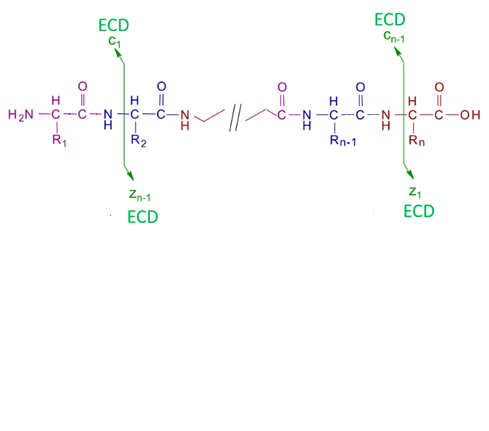 電子捕獲解離(Electron capture dissociation,ECD)與傳統(tǒng)的串聯(lián)質(zhì)譜技術(shù)互補,主要用于FT-ICR質(zhì)譜。二硫鍵通常對振動解離穩(wěn)定,但在 ECD 中優(yōu)先斷裂,快速且具有特異性,且不穩(wěn)定的翻譯后修飾和非共價鍵在主鏈鍵解離后也能保持完整。結(jié)合ECD,可以實現(xiàn)更高的序列覆蓋,在一定能量下,也可以區(qū)分異亮氨酸和亮氨酸。ECD 的主要應(yīng)用領(lǐng)域包括DNA預(yù)測蛋白質(zhì)序列的Top-down驗證、從頭測序、二硫鍵分析以及翻譯后修飾分析。