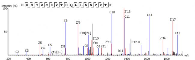 蛋白被酶切為長短不一的肽段后,經(jīng)過ESI等離子源電離,成為帶有若干正電荷的母離子(precursor),然后通過離子通道進入質(zhì)譜完成MSn譜圖掃描。根據(jù)不同的分析需求,可以選擇不同的母離子碎裂方法,如 CID/HCD、ETD等。每種碎裂方法產(chǎn)生不完全相同的碎片離子,借助這些離子的互補信息可實現(xiàn)全面的蛋白序列表征。