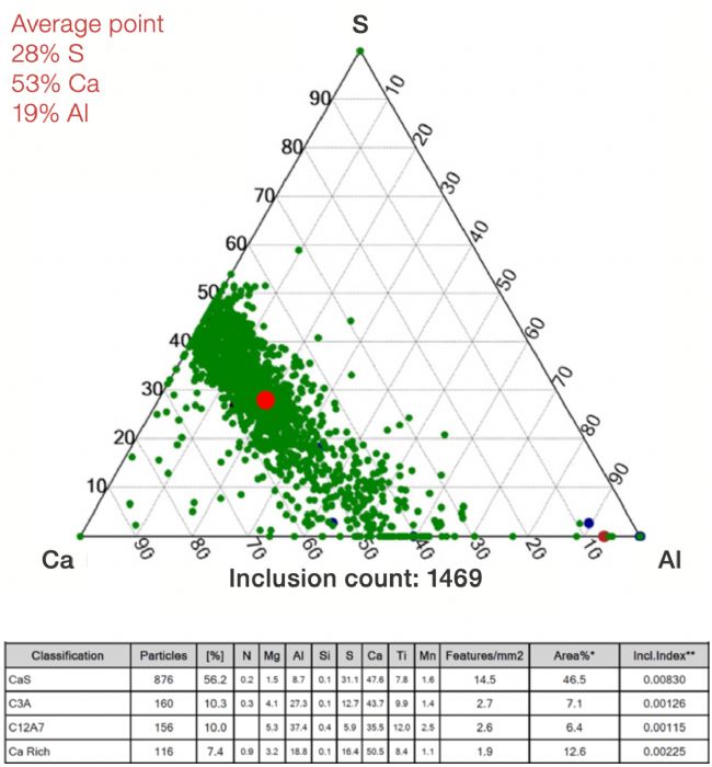 圖3添加鈣后鋁鎮(zhèn)靜鋼包樣品的自動掃描電鏡成像。Ca-Al-S 三元相圖(上)和分類表(下)顯示,該爐鋼中的夾雜物富含鈣和硫,平均夾雜物中的硫含量(28%)高于鋁含量(19%)