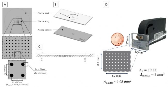 (A) 噴嘴陣列設(shè)計細(xì)節(jié);(B) 芯片表面,包括噴嘴入口和噴嘴表面;(C) 噴嘴芯片的橫截面圖,顯示噴嘴入口和噴嘴高度;(D) 組裝好的墨盒和噴頭示例