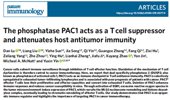 2020年1月,在《Nature Immunology》發(fā)表的題為“The phosphatase PAC1 acts as a T cell suppressor and attenuates host antitumor immunity”的研究論文,揭示了磷酸酶PAC1在腫瘤免疫中的作用及其分子機制。研究團隊借助CUT&Tag、ATAC-seq和ChIP-seq等技術,證實了PAC1通過招募NuRD復合體,重塑T細胞染色質開放性,抑制下游效應基因表達,促使T細胞耗竭,削弱宿主抗腫瘤免疫力。此項研究首次將PAC1明確為腫瘤免疫治療的潛在靶點,為開發(fā)新型腫瘤免疫療法提供了關鍵理論依據(jù)。