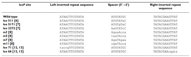 圖1 . loxP位點及其突變體位點[1]