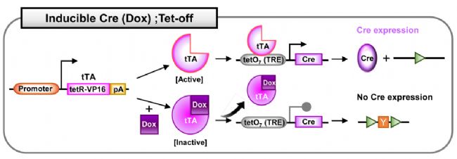 Cre;Tet-off系統(tǒng):Dox給藥后關(guān)閉Cre表達。在Tet-off系統(tǒng)中,在沒有Dox的情況下,激活的tTA能夠結(jié)合Cre前的TRE序列并誘導(dǎo)Cre表達。而在Dox給藥后,與Dox相互作用的tTA被滅活。滅活的rTA不再與TRE結(jié)合,因此Cre表達受到抑制。