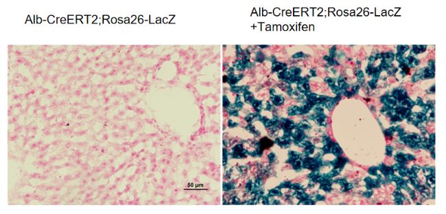 圖8. Alb-CreERT2; Rosa26-LacZ小鼠肝組織X-gal染色。未使用他莫昔芬誘導(dǎo)的小鼠,肝細胞未被染色;使用他莫昔芬誘導(dǎo)的小鼠,肝細胞成功著色。