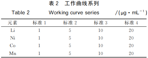 鹽酸、硝酸、高氯酸(分析純,國(guó)藥集團(tuán));實(shí)驗(yàn)用水三級(jí)水即可;鋰、鎳、錳和鈷標(biāo)準(zhǔn)儲(chǔ)備溶液(1000μg/mL)。