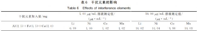 二次電池廢料中除鋰、鎳、錳和鈷外,主要存在10%左右的C、0.50%左右的S、15%左右的FE、25%左右的AL和20%左右的Cu等元素。表5中的結(jié)果表明,C、S的存在對(duì)測(cè)定結(jié)果基本沒(méi)有影響。在100mL容量瓶中加入2.5mgAL、1.5mgFE和2.0mgCu的干擾元素(按最小稀釋倍數(shù)稀釋后溶液中所含基體元素的最大含量加入)和Li、Ni、CO和Mn標(biāo)準(zhǔn)溶液配制成濃度為1.00μg/mL和10.00μg/mL的混合標(biāo)準(zhǔn)溶液,按方法測(cè)定其濃度值,結(jié)果見(jiàn)表6。