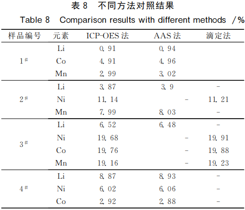 對(duì)二次電池廢料試樣1!4#,按照實(shí)驗(yàn)方法進(jìn)行溶解樣品,分別采用ICP-OES法、AAS法(Li;含量≤10%Ni、CO和Mn)和滴定法(含量>10%Ni、CO和Mn)測(cè)定Li、Ni、CO和Mn元素,三種方法測(cè)定結(jié)果基本一致(表8)。