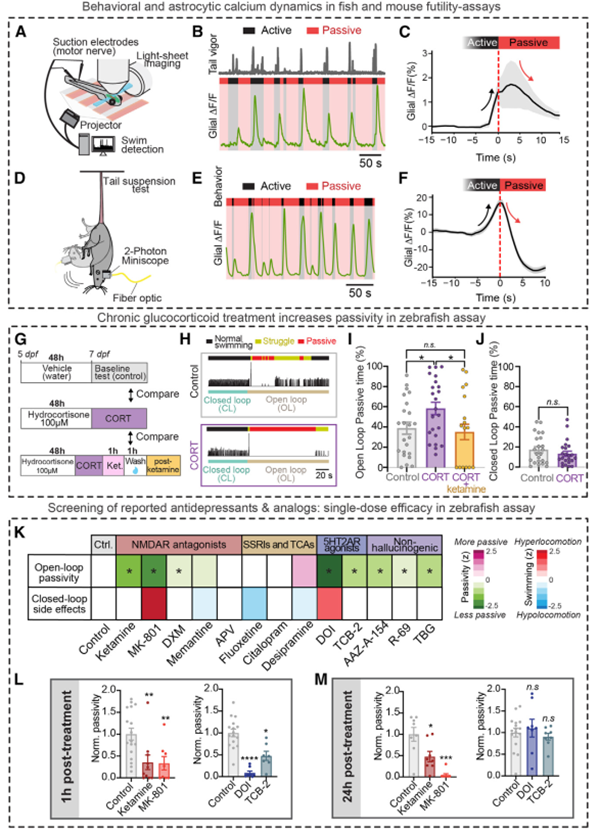 斑馬魚因無效性誘導(dǎo)的被動性實驗與嚙齒動物習(xí)得性無助模型(如懸尾實驗)有共同特征,即試圖擺脫厭惡情境的嘗試都是徒勞的,且都包含激烈掙扎和消極被動狀態(tài)這兩種情況。在無效的情境下,小鼠和斑馬魚都會表現(xiàn)出從主動行為向被動行為的轉(zhuǎn)變。此前的研究表明,在斑馬魚中,無效運(yùn)動在星形膠質(zhì)細(xì)胞中引起強(qiáng)烈的,通常是全腦的鈣信號(圖2A-C)。