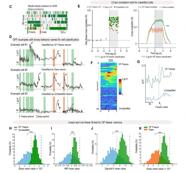 進(jìn)一步對(duì)采集的雙光子數(shù)據(jù)分析結(jié)果顯示,OF Freeze神經(jīng)元表現(xiàn)出顯著的正線性斜率,這表明它們對(duì)Freezing行為的響應(yīng)呈線性增加。此外,它們的鈣信號(hào)改變顯著高于未分類神經(jīng)元,大約73.24%的vHPC CaMKIIα神經(jīng)元在響應(yīng)Freezing行為時(shí)表現(xiàn)出鈣活動(dòng)升高?偟膩碚f,OF Freeze神經(jīng)元的鈣活動(dòng)變化與觀察者的Freezing狀態(tài)高度正相關(guān),這表明vHPC中的OF Freeze神經(jīng)元是一群編碼觀察者共情恐懼的神經(jīng)元(圖3)。