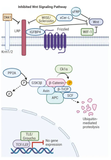 - 無(wú)Wnt信號(hào)時(shí):β-Catenin被 降解復(fù)合體(APC/Axin/GSK-3β/CK1)磷酸化,經(jīng)泛素-蛋白酶體途徑降解。