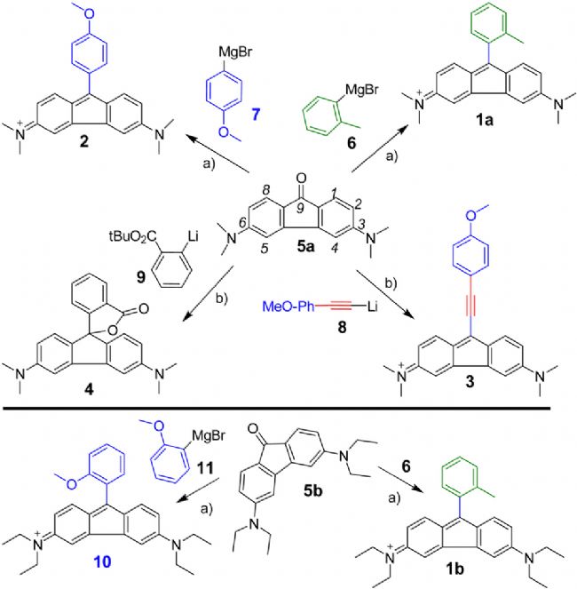 為篩選影響光學(xué)性質(zhì)的取代基,研究者采用模塊化策略在核心結(jié)構(gòu)3,6-二甲基氨基芴酮(5,方案1)的C9位進(jìn)行后期修飾。除參照物鄰甲苯基(6)外,還選用了富電子的對(duì)甲氧基苯基(7)、含炔烴的擴(kuò)展共軛版本(9)、可形成內(nèi)酯的鄰羧酸苯基(8)以及缺電子的3,5-雙(三氟甲基)苯基。所有化合物均通過(guò)一維、二維核磁共振及質(zhì)譜確證結(jié)構(gòu)。