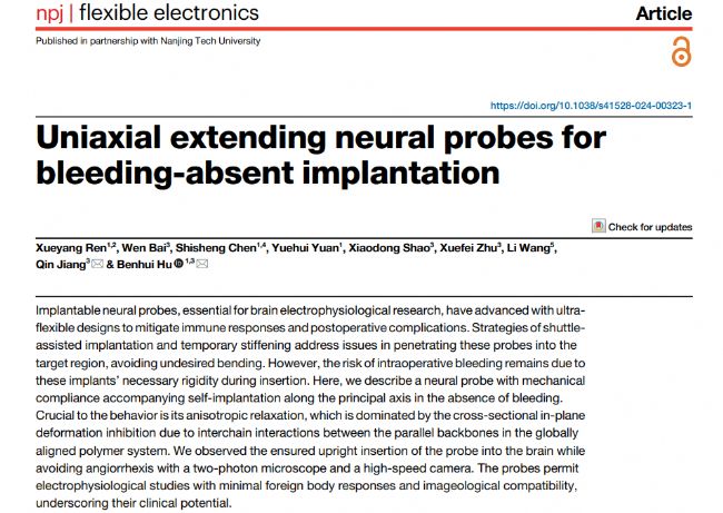 Ren, X., Bai, W., Chen, S. et al. Uniaxial extending neural probes for bleeding-absent implantation. npj Flex Electron 8, 36 (2024)