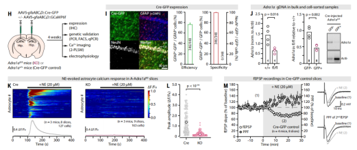 為進(jìn)一步確定NE是直接通過神經(jīng)元來源的α1-ARs還是間接通過星形膠質(zhì)細(xì)胞α1-ARs發(fā)揮調(diào)控突觸功能,研究人員分別構(gòu)建特異性敲除神經(jīng)元α1-ARs小鼠(N-Adra1aKO小鼠)和敲除星形膠質(zhì)細(xì)胞α1-ARs小鼠(A-Adra1aKO小鼠)。結(jié)果發(fā)現(xiàn)野生型小鼠和N-Adra1aKO小鼠海馬神經(jīng)元在接受NE處理后均出現(xiàn)局部興奮性突觸后電流降低和雙脈沖易化指數(shù)增加,A-Adra1aKO小鼠并不出現(xiàn)上述突觸抑制的作用,表明NE間接通過星形膠質(zhì)細(xì)胞,而不是直接通過神經(jīng)元來源,α1-ARs調(diào)控突觸功能。