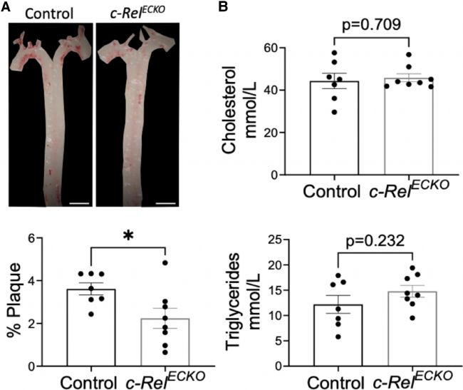 最后,為了具體分析內(nèi)皮 c-REL 對動脈粥樣硬化的影響,生成內(nèi)皮特異性c-REL 敲除(c-RelECKO)和對照小鼠。AAV-PCSK9 處理并暴露于西方飲食 8 周以誘發(fā)高膽固醇血癥后,c-RelECKO組與對照組相比,小鼠的主動脈粥樣硬化斑塊顯著較。▓D4 A),而血漿膽固醇和甘油三酯水平保持不變(圖4 B)。這些發(fā)現(xiàn)強調(diào)了內(nèi)皮 c-Rel 是動脈粥樣硬化的驅(qū)動因素,這與它在動脈樹的動脈粥樣硬化區(qū)促進炎癥和內(nèi)皮細胞更新的能力是一致的。