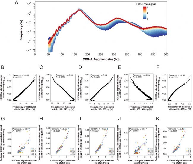 圖2:cfDNA片段大小模式與通過匹配樣本的cfChIP-seq測序檢測的循環(huán)核小體H3K27ac信號之間的相關性。