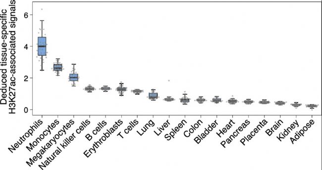 圖4:利用組織特異性組蛋白修飾區(qū)域的片段大小推斷H3K27ac相關信號分布。測序后的cfDNA分子來自38名健康對照個體。H3K27ac相關信號通過230-350bp范圍內(nèi)的分子大小頻率推斷。