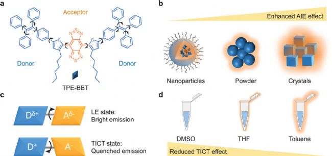 圖2. a)TPE-BBT的化學結構。b)TPE-BBT的AIE效應示意圖。c)TICT工藝示意圖。d)TPE-BBT溶液隨溶劑極性降低而增強的PL強度示意圖
