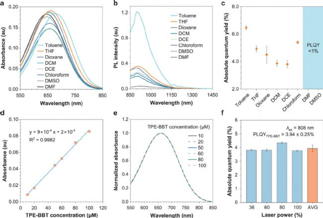 本文首先測量了TPE-BBT在不同溶劑中的吸收和發(fā)射光譜。如圖3a、b所示,TPE-BBT在低極性的甲苯中展現(xiàn)出最顯著的紅移吸收和最強的PL強度。在中等極性的溶劑(四氫呋喃(THF)、二氧六環(huán)、二氯甲烷(DCM)、1,2-二氯乙烷(DCE)和氯仿)中,TPE-BBT的吸收略有藍移,伴隨著熒光強度的下降。使用高極性的溶劑如二甲基亞砜(DMSO)和二甲基甲酰胺(DMF)會導致吸收峰進一步藍移,且這些溶劑會導致熒光強度顯著下降和輕微紅移。這些結果表明TPE-BBT具有明顯的TICT效應。然后,使用808 nm激光激發(fā)(通常用于NIR-II生物成像)測量了TPE-BBT在不同溶劑中的PLQY(圖3c)。在低極性的甲苯中,TPE-BBT具有最高的PLQY(>6%)。在中等極性的溶劑中,TPE-BBT也顯示出約4-5%的高PLQY。在高極性的溶劑如DMSO中,積分球在此時無法檢測到足夠的NIR-II光子,無法測量到可靠的PLQY。