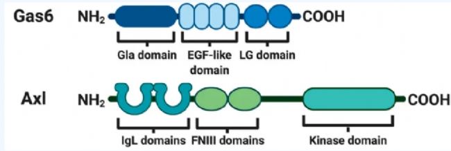 AXL源于希臘語“Anexelekto”,意為“不受控制的”,AXL于1988年首次分離,并被鑒定為致癌基因。人類AXL基因位于染色體19q13.2,編碼20個(gè)外顯子。外顯子1-10編碼細(xì)胞外結(jié)構(gòu)域,包括信號(hào)肽、兩個(gè)免疫球蛋白(Ig)結(jié)構(gòu)域和兩個(gè)纖連蛋白Ⅲ型(FNⅢ)結(jié)構(gòu)域。外顯子11編碼一個(gè)受蛋白水解切割的短的細(xì)胞外區(qū)域,以及整個(gè)跨膜結(jié)構(gòu)域。外顯子12-20編碼細(xì)胞內(nèi)結(jié)構(gòu)域,包括酪氨酸激酶結(jié)構(gòu)域。