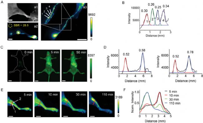 相較于單色成像,多色活體成像可顯著提升信息密度。利用950 nm帶通(BP,925–975 nm)與1150 nm長通(LP)濾光片的光譜拆分特性,CA965-NPs與CA985-NPs可實現(xiàn)雙色成像,成功應(yīng)用于小鼠左右腿腘淋巴結(jié)的同步顯影。為進一步提升成像可靠性,研究團隊通過DSPE-PEG2000載體共載CA985與CA965制備CA965/CA985-NPs,利用比率熒光測量技術(shù)消除外部干擾因素影響。在小鼠腿部血管比率成像實驗中,950 nm BP(紅光通道)與1150 nm LP(綠光通道)雖均可顯示血管輪廓,但難以區(qū)分動靜脈(圖5A)。通過比率成像處理(圖5a5),背景噪聲顯著降低,血管半峰寬(FWHM)由≈0.26 mm優(yōu)化至0.20 mm(圖5B),實現(xiàn)動靜脈的清晰分辨。此外,比率信號從左至右的梯度變化(圖5a5)精確反映了血管距皮膚表面的深度遞減趨勢,該特征在單色成像中較難獲取。
