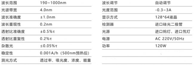 試驗(yàn)所用的檢測設(shè)備:電子天平、UV-1100紫外可見分光光度計(jì)等,其中電子天平的量程為220g,可讀性和重復(fù)性為1mg;紫外可見分光光度計(jì)具體的技術(shù)參數(shù)如下表所示。