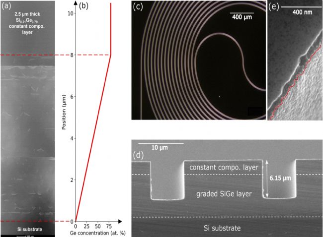 團(tuán)隊使用了從模擬傳播損耗(也就是研究的所有所關(guān)注的貢獻(xiàn)之和)出發(fā)來定義傳播損耗,結(jié)果以黑體畫出在上圖中。結(jié)果顯示,在5到9微米的范圍內(nèi),這個模型給出了一個不錯的估算。然而,在9微米以上的波長范圍內(nèi),實驗測量與理論模型之間存在一個差值低于2分貝每厘米。除此之外,還列舉了幾個可能的原因來解釋這一差異。首先是模擬模型沒有考慮梯度層中的殘余應(yīng)變——該模型未考慮梯度層中殘余應(yīng)變,它會影響晶格結(jié)構(gòu)的散射關(guān)系,并從而影響多波吸收。然而,目前沒有相關(guān)的研究探討多波吸收與SiGe alloys中的缺陷的關(guān)系。其次可能是梯度層中存在缺陷,在這種情況下,缺陷可以對較大的光子波長產(chǎn)生更多影響,因為光學(xué)模式的尺寸增加,從而與這些缺陷發(fā)生重疊。但對缺陷密度與傳播損耗之間的關(guān)系進(jìn)行精確量化是十分困難的。