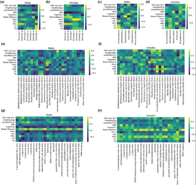 研究結果表明,腸道微生物組多樣性與運動能力參數(shù)之間存在顯著負相關。如在男性中,微生物組多樣性與最大攝氧量(VO2max)、垂直跳躍高度(JumpMax)和氧化還原平衡(Redox Balance)呈負相關,而與甘油三酯水平呈正相關。在女性中,微生物組多樣性與體重指數(shù)(BMI)和認知測試表現(xiàn)呈負相關。此外,某些特定細菌種類(如男性中的Fusicatenibacter saccharivorans,女性中的Roseburia faecis)與運動能力參數(shù)顯著相關。