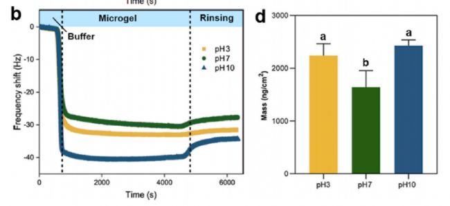 - 吸附動(dòng)力學(xué)定量:實(shí)時(shí)監(jiān)測(cè)微凝膠在疏水表面的吸附過程,揭示pH 3(溶脹態(tài))與pH 7(非溶脹態(tài))下吸附層厚度與質(zhì)量的差異(圖2b-d)。