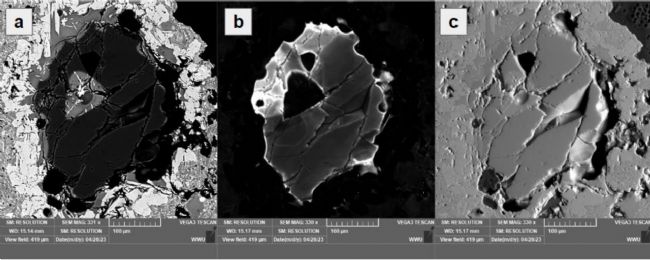 這張圖展示了在掃描電子顯微鏡(SEM)下拍攝的三種不同類型的圖像。每張圖像都是同一石英晶體。從左到右分別是背散射電子(BSE)圖像、陰極發(fā)光(CL)圖像和陰影(SE)圖像。BSE 圖像顯示了團(tuán)塊的晶體結(jié)構(gòu),CL 成像展示了石英晶體的生長(zhǎng)帶,而 SE 陰影圖像顯示了樣品的表面。