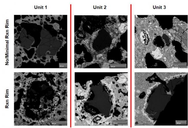 展示了來(lái)自 Cinder Cone 火山灰按孔隙度遞增序的掃描電子顯微鏡(SEM)圖像。最左邊的圖像是金色火山灰團(tuán)塊,中間的圖像是黑色火山灰團(tuán)塊,而最右邊的圖像是致密火山灰團(tuán)塊。