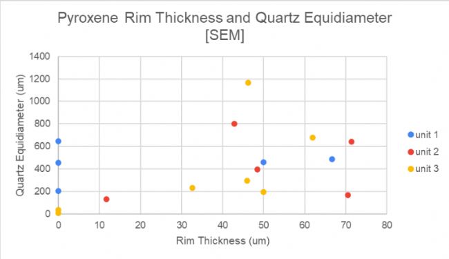圖表描述了石英晶體的等效直徑(以微米計(jì))與單斜輝石反應(yīng)邊厚度(以微米計(jì))之間的關(guān)系。所展示的數(shù)據(jù)是通過(guò)掃描電子顯微鏡(SEM)成像技術(shù)收集的。