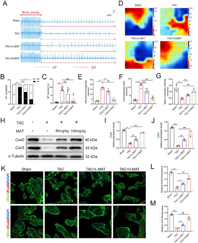 隨后,應(yīng)用多通道電生理標(biāo)測技術(shù)研究了MAT對TAC誘導(dǎo)的小鼠模型中心房電重構(gòu)的影響。結(jié)果表明,在TAC組中,心房顫動(dòng)(AF)易感性顯著增強(qiáng),且AF發(fā)作持續(xù)時(shí)間明顯延長。然而,MAT干預(yù)后,AF的發(fā)生率和持續(xù)時(shí)間均顯著降低。此外,與假手術(shù)組相比,TAC組的心房電傳導(dǎo)速度降低、傳導(dǎo)異質(zhì)性增強(qiáng)且異質(zhì)性指數(shù)升高。值得注意的是,MAT給藥改善了心房電傳導(dǎo)速度和均勻性指數(shù)。連接蛋白是維持心肌細(xì)胞電生理功能的關(guān)鍵縫隙連接通道,通過Western blot分析和免疫熒光染色檢測心房組織中Cx40和Cx43水平,發(fā)現(xiàn)MAT干預(yù)后連接蛋白表達(dá)增加,尤其是高濃度組。這些發(fā)現(xiàn)表明,TAC誘導(dǎo)的心房電重構(gòu)會增加AF易感性,而MAT可減輕這種重構(gòu)并降低AF易感性。