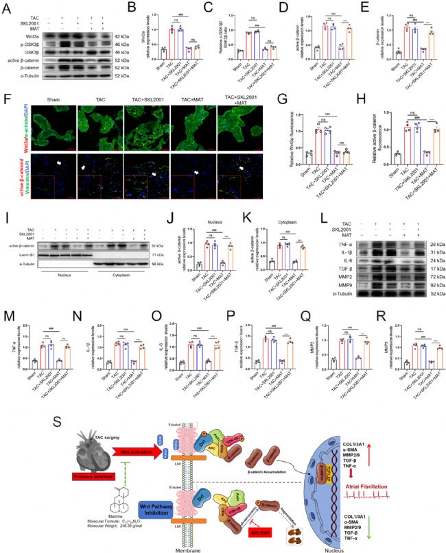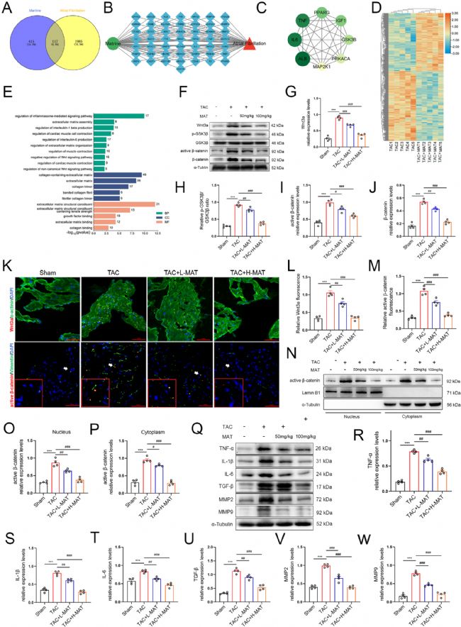 研究通過篩選PPI網(wǎng)絡(luò)確定MAT治療房顫的8個(gè)核心靶點(diǎn),其中GSK3β是Wnt3a/β- Catenin通路關(guān)鍵負(fù)調(diào)控因子。RNA測序和GO分析顯示MAT富集于Wnt通路負(fù)調(diào)控等過程。Western blot和免疫熒光證實(shí)TAC組Wnt3a/β- Catenin通路激活,而MAT呈劑量依賴性抑制該通路,并逆轉(zhuǎn)TAC誘導(dǎo)的TGF-β、炎癥因子等表達(dá)升高。表明MAT可能通過抑制Wnt3a/β- Catenin通路調(diào)節(jié)心房纖維化和炎癥。
