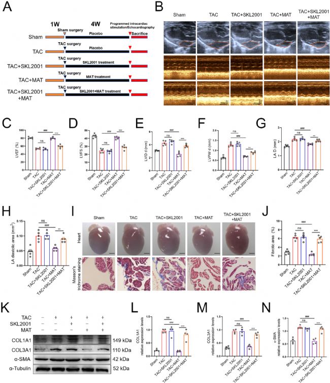 研究通過超聲心動(dòng)圖、Masson染色及蛋白表達(dá)檢測,評估MAT對TAC損傷小鼠的影響。結(jié)果顯示,MAT可緩解TAC誘導(dǎo)的心臟增大和心功能受損,顯著減少心房纖維化且呈劑量依賴性,同時(shí)降低COL1A1、COL3A1和α-SMA等纖維化相關(guān)蛋白表達(dá)。表明MAT對TAC誘導(dǎo)的小鼠心功能不全和心房重構(gòu)有顯著抑制作用。