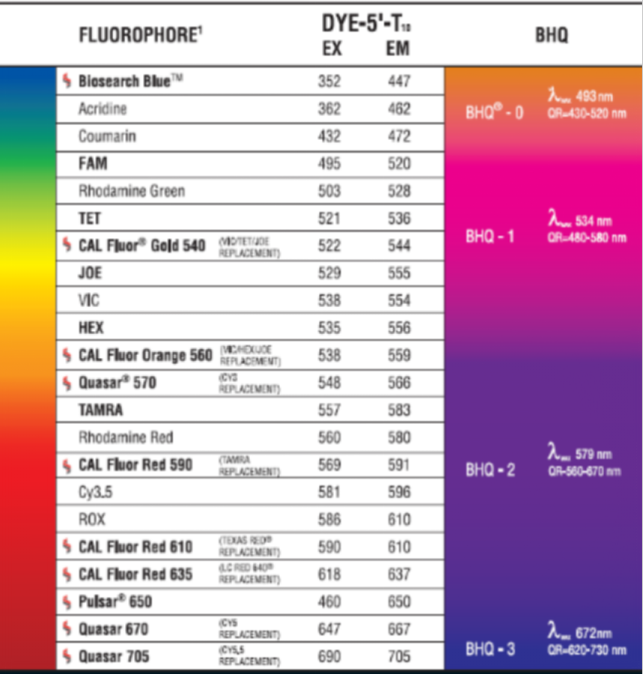 一般qPCR設(shè)備會(huì)配有1個(gè)或多個(gè)不同的熒光通道,根據(jù)儀器熒光通道的配置,可以通過對(duì)不同靶標(biāo)基因的探針標(biāo)記不同的熒光基團(tuán),以實(shí)現(xiàn)多重PCR的檢測(cè)。常用的熒光基團(tuán)及淬滅基團(tuán)如下: