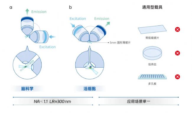 2. 無(wú)法適配常規(guī)載具:操作空間受限,傳統(tǒng)正交物鏡的樣品必須懸空固定,無(wú)法使用常規(guī)載玻片或培養(yǎng)皿。正置 V 形雙物鏡的載具只能是 5 mm 圓形薄玻片,常規(guī)載玻片、培養(yǎng)皿和孔板不能適配。