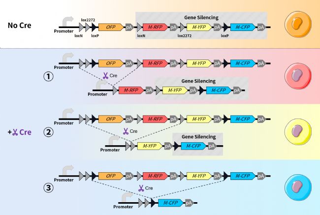 3 序列中存在兩個同向的loxP位點(圖中黑色三角形),Cre酶會切除兩個loxP位點之間的序列(橙色熒光OFP序列、紅色熒光M-RFP序列與黃色熒光M-YFP序列被切除)。之后,該系統(tǒng)按照啟動子的方向,表達藍色熒光M-CFP,因而細(xì)胞呈現(xiàn)藍色。
