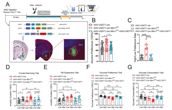 研究人員進(jìn)一步通過構(gòu)建MEN1點(diǎn)突變小鼠,該小鼠杏仁核MEN1蛋白水平不發(fā)生變化,GAT1蛋白水平下降。MEN1點(diǎn)突變小鼠在經(jīng)歷2周自由酒精攝入實(shí)驗(yàn)后可引起酒精偏好和抑郁樣行為,在過表達(dá)杏仁核抑制性神經(jīng)元GAT1蛋白后可降低酒精偏好,并改善抑郁樣行為。