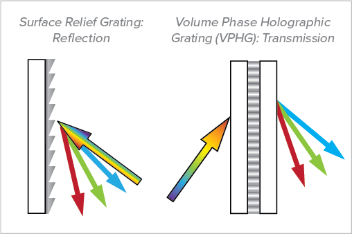 相比之下,體積相位光柵可以比標(biāo)準(zhǔn)的表面浮雕光柵更厚,并且它們沒有開放的凹槽。它們的工作原理是基于介質(zhì)中折射率的變化(即指數(shù)調(diào)制),通過調(diào)整介質(zhì)的厚度和折射率調(diào)制,使其能夠在不同的波長下工作。體相光柵通常被用作透射光柵。