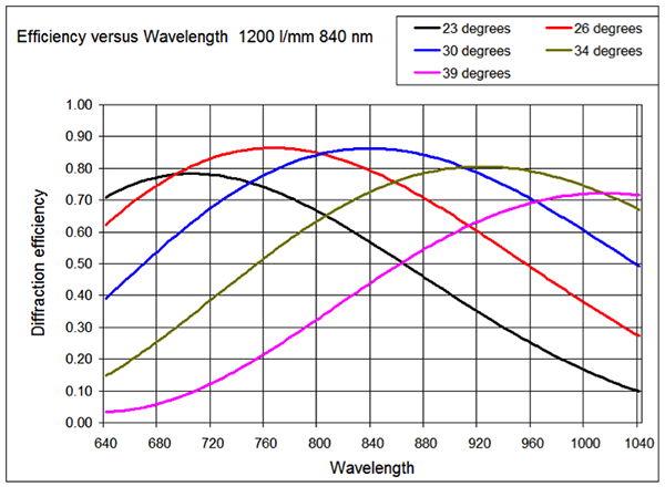 體相光柵的另一個優(yōu)點(diǎn)是能夠改變?nèi)肷浣,以有利于光譜的某個區(qū)域,從而獲得更高的效率。圖5.顯示了1200 l/mm光柵效率曲線如何隨著入射角通過一系列角度的變化而變化。