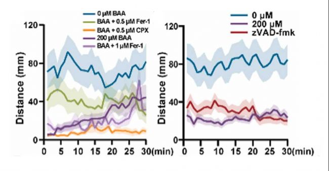 溴乙酸(BAA)是一種普遍存在的環(huán)境污染物,針對(duì)BAA的毒性研究主要集中在其體外細(xì)胞毒性上,而對(duì)其神經(jīng)發(fā)育毒性的研究不足。上述研究以斑馬魚為模式生物,通過神經(jīng)行為分析、體內(nèi)雙光子成像、轉(zhuǎn)錄組測(cè)序、藥理干預(yù)和分子生物學(xué)檢測(cè),全面探究 BAA 的毒性作用,揭示其分子機(jī)制。結(jié)果表明,BAA 在斑馬魚早期發(fā)育過程中誘導(dǎo)了多個(gè)指標(biāo)的顯著變化。BAA 破壞了斑馬魚幼體的運(yùn)動(dòng)活動(dòng)、對(duì)明暗刺激和振動(dòng)刺激的反應(yīng)。轉(zhuǎn)錄組學(xué)分析顯示受BAA刺激的斑馬魚表現(xiàn)出視覺轉(zhuǎn)導(dǎo)相關(guān)基因的下調(diào)以及鐵死亡和細(xì)胞凋亡的激活。通過抑制鐵死亡和細(xì)胞凋亡可以抑制上述神經(jīng)行為障礙。在實(shí)驗(yàn)探究中,AbMole的兩款鐵死亡抑制劑 Ferrostatin-1(Fer-1, 鐵抑素-1,AbMole,M2698)和Ciclopirox ethanolamine(AbMole,M3593)被用于處理斑馬魚幼體,以探究鐵死亡在BAA誘導(dǎo)的神經(jīng)毒性中的作用[4]。