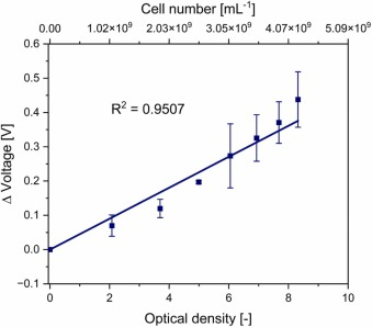 圖 2 . 基于 Arduino 的吸光度傳感器系統(tǒng)在不同光密度(λ=600nm,范圍為 0 至 8.32)和細(xì)胞數(shù)量(范圍為 0 至 4.23×109 mL-1 )下相對(duì)于 OD=0 的電壓變化此圖展示了毛細(xì)管波微生物反應(yīng)器(cwMBR)芯片中的數(shù)據(jù)情況。
