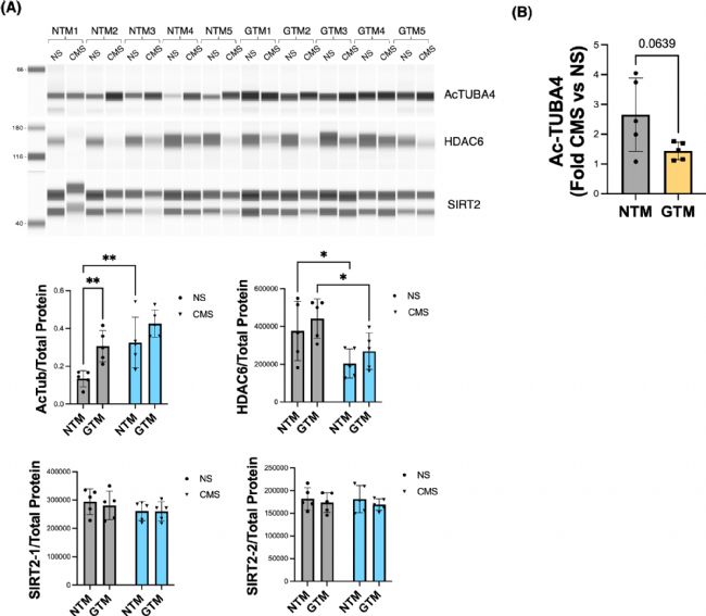 接下來(lái),使用從受青光眼(GTM)和年齡匹配對(duì)照組(NTM)影響的供體眼睛中分離的 TM 細(xì)胞的原代培養(yǎng)物重復(fù)上述實(shí)驗(yàn)。值得注意的是,在非拉伸條件下,與 NTM 培養(yǎng)物相比,GTM 培養(yǎng)物表現(xiàn)出更高水平的 Ac-TUBA4 (圖2 A)。然而,在 GTM 細(xì)胞和 NTM 細(xì)胞之間未觀察到 HDAC6 或任何 SIRT2 亞型表達(dá)的顯著差異(圖2 A)。CMS 的應(yīng)用進(jìn)一步增加了 GTM 細(xì)胞中 Ac-TUBA4(圖2 B)。這表明,青光眼型 TM 細(xì)胞中的微管蛋白乙;缴。
