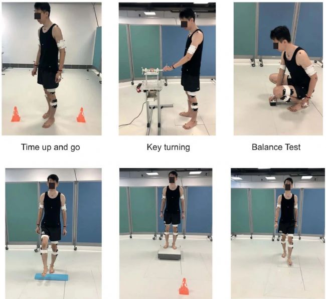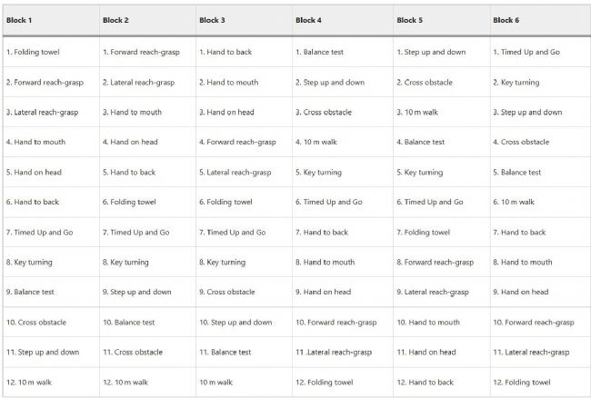 為了得到可靠、嚴(yán)謹(jǐn)、高質(zhì)量的數(shù)據(jù),研究團(tuán)隊對實驗參與者進(jìn)行了嚴(yán)格的篩選,排除了三個月內(nèi)存在神經(jīng)系統(tǒng)疾病、手術(shù)或醫(yī)療狀況、嚴(yán)重視覺問題等可能存在影響實驗進(jìn)行的情況的患者。截止文章發(fā)表時,研究團(tuán)隊共招募了10名健康受試者。接下來,受試者被要求完成6項上肢任務(wù)及6項下肢任務(wù)(見圖2、圖3),包括折疊毛巾,前伸抓握,側(cè)伸抓握,手夠到嘴,手夠到頭部,手夠到背部,定時起立行走,轉(zhuǎn)動鑰匙,平衡測試,跨過障礙物,上下臺階,10 米行走。這12項任務(wù)由專業(yè)作業(yè)治療師和物理治療師選出,任務(wù)均為日常生活的代表性任務(wù)。研究讓團(tuán)隊將這12個任務(wù)的順序采用區(qū)組隨機(jī)化(見圖4)方式進(jìn)行安排,該順序通過在試驗前擲骰子決定,以減少因患者精神和身體疲勞而造成的實驗結(jié)果偏差。對于上肢任務(wù),受試者每側(cè)肢體重復(fù)每個動作6次;對于下肢任務(wù),受試者每側(cè)肢體重復(fù)每個動作3次。
