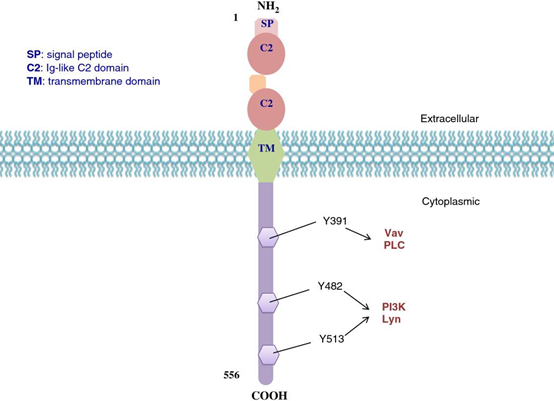 CD19是一種由B細胞表達的CD分子,即白細胞分化抗原。除漿細胞外的所有B細胞系、惡性B細胞與濾泡樹突狀細胞(FDC)都會表達該分子。作為參與B細胞增殖、分化、活化及抗體產(chǎn)生的重要膜抗原,CD19還能促進B細胞受體(BCR)的信號轉導。從結構上看,CD19屬于I型跨膜蛋白,具有單個跨膜結構域、胞內C末端和胞外N末端。其胞外段含有兩個C2型Ig樣結構域,而胞內結構域高度保守,由242個氨基酸組成,在C末端附近存在9個酪氨酸殘基。研究表明,CD19的生物學功能主要依賴于三個細胞質酪氨酸殘基:Y391、Y482和Y513。